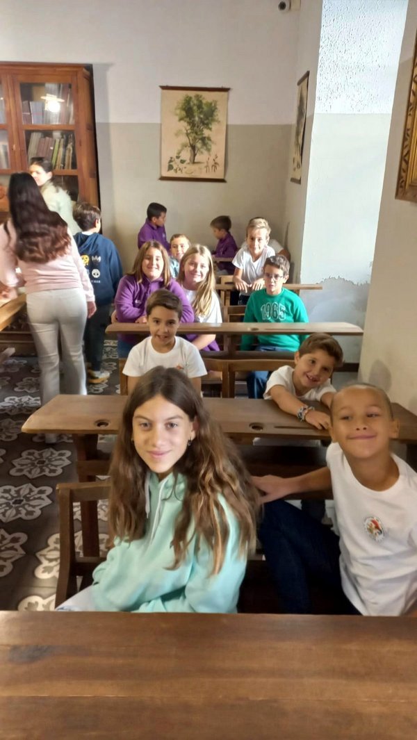 Los más pequeños disfrutando, de los antiguos pupitres de la antigua Universidad.