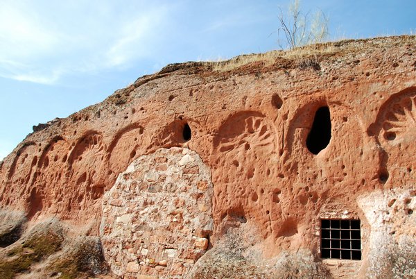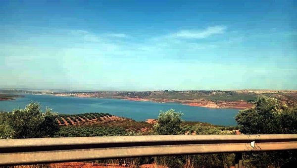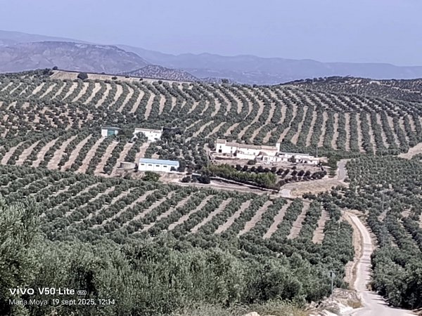 Foto del cortijo del Cura con Los Cerros de Úbeda al fondo.
