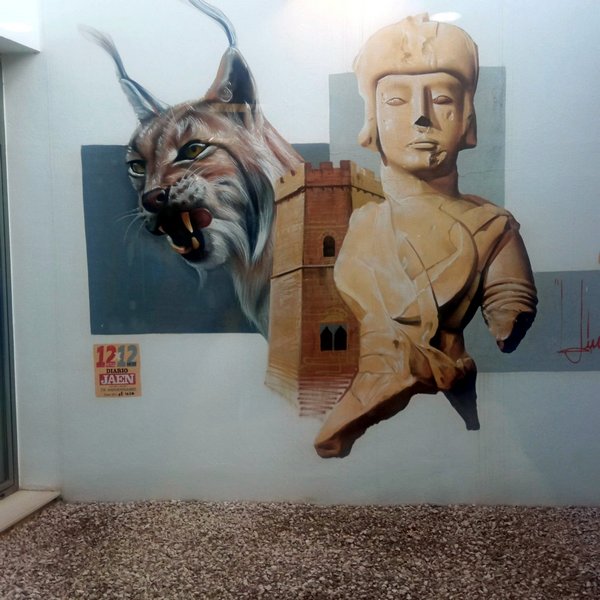 Lienzo del Lince Íberico y El guerrero de doble armadura de Cerrillo Blanco de Porcuna, en el Museo de Arte Contemporáneo.