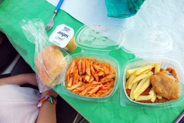 Comida de los niños, macarrones con tomate, escalope con patatas, pan y yogour de postre.